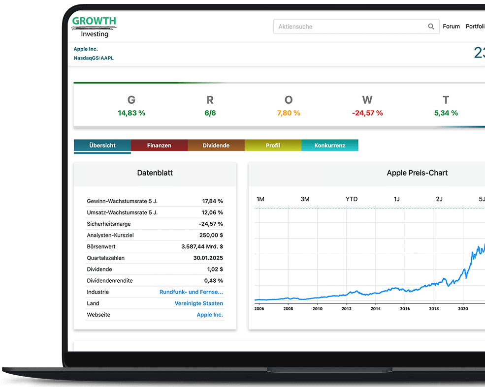 The GROWTH Investing software provides an overview of key metrics and offers color-coded evaluations and targeted filtering options. This enables the identification of stocks with high return potential and manageable risk. It is complemented by practical tools such as watchlists and portfolios, which facilitate efficient planning and monitoring of investments. This creates a solid foundation for informed decisions and a calm approach to wealth management. Ideal for anyone who wants to manage their investments strategically and confidently.